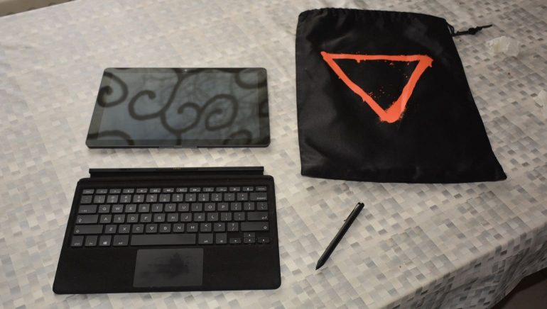 Van een afstandje lijkt het alsof je een Microsoft Surface-tablet voor je neus hebt. Hij is alleen zwart, niet grijs. En het logo ontbreekt. Sterker nog, er is op heel de tablet geen enkel logo te zien. Wil je een hint hebben welk merk je onder handen hebt, kijk dan naar het bijbehorende toetsenbord. Dat biedt twee toetsen die afwijken van alle andere keyboards.