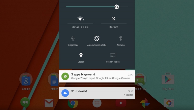 In het kort valt Lollipop vooral op door een paar nieuwe designkeuzes, waar vooral veel meer kleur en meer animaties gebruikt worden. Bijna alles wat je doet op het scherm reageert nu en dat maakt, als het werkt, voor een ervaring waar je acties veel directer aanvoelen. De meeste apps en icoontjes hebben de stap al gemaakt, al heeft Google nog niet al zijn apps geüpdatet. Zo is de Google Plus-app nog in de ‘oude stijl’ bijvoorbeeld.