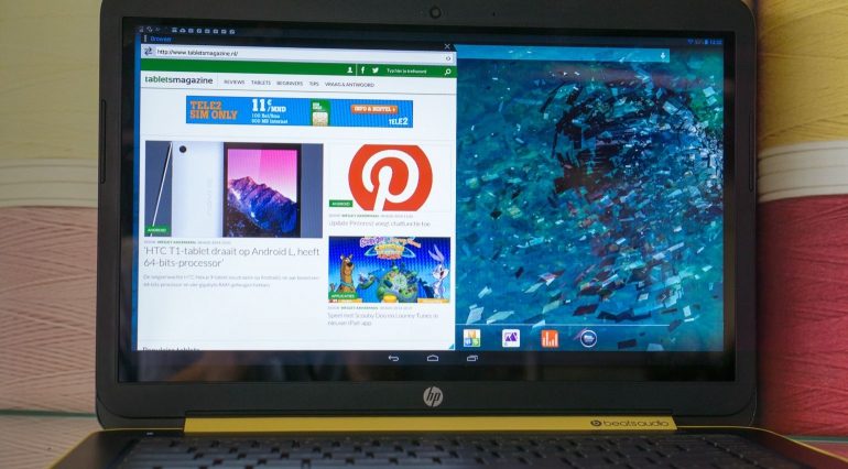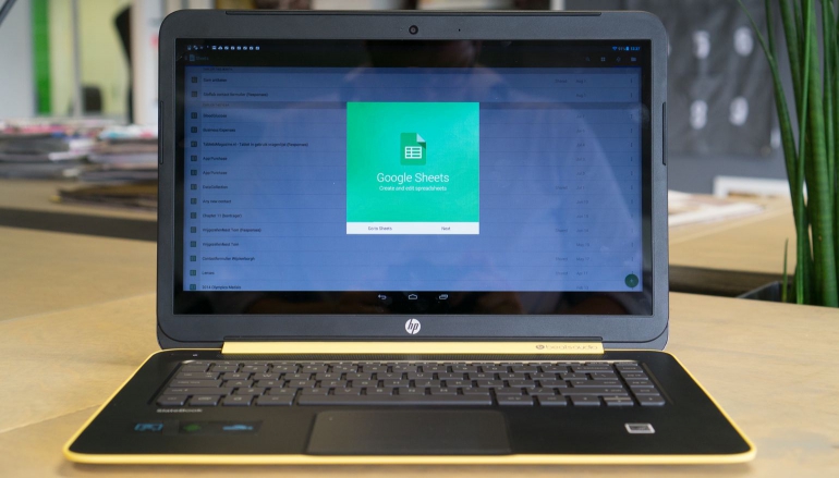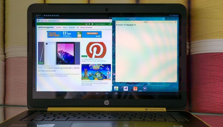 Het is echter het volwassen app-aanbod dat je kan vinden in de Google Play Store dat het verschil maakt. Natuurlijk is niet iedere app geoptimaliseerd voor het gebruik op een 14-inch laptopscherm, maar een hoop apps weten zich opvallend goed aan te passen aan deze vorm van gebruik. Dan heb ik het vooral over apps als Pocket en Google’s Office pakket. Natuurlijk is ook de Chrome-browser een belangrijke app op deze HP Slatebook 14. Het is opvallend hoe goed de browser zich vergelijkt met Chrome op een ‘echte’ computer, er is eigenlijk geen echt verschil. Dat maakt wat mij betreft ook dat deze HP Slatebook 14 een betere combinatie dan een Chromebook weet te maken tussen hardware en software. Waar een Chromebook nog best wat beperkingen heeft is de wereld van Android niet alleen meer ‘open’ maar vooral ook voorzien van een veel beter app-aanbod. In combinatie met diensten als Google Drive, Google Music en andere onderdelen van het Google ecosysteem is eigenlijk alles wat je als normale consument nodig hebt van een laptop goed te doen. Er zijn zelfs apps die het mogelijk maken meer dan éé ding tegelijk op het grote 14 inch scherm te hebben, de app Multitasking uit de Play Store zorgde er voor mij voor dat ik zowel een browser-scherm als een kladblok-app waar deze review in getikt is open had staan. Via de HDMI poort en drie USB-aansluitingen is de HP Slatebook 14 ook goed inzetbaar als ‘bureau’ machine.