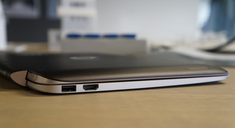 De uitvoering die ik hier heb heeft een donkere (het gaat mij te ver om het zwart te noemen) buitenkant en een aluminiumkleurige binnenzijde. Natuurlijk wordt het scherm/paneel beschermd door stevig (Gorilla) glas. Onder de glazen voorkant is een rand vrijgehouden voor de speakers en dit iets dunnere gedeelte is ook de plek waar we een paar openingen/gleuven vinden waarmee het tablet/scherm-gedeelte verbonden wordt met het dock. Het scharnier-gedeelte is opvallend stevig en ondanks de vrij zware tablet voelt ook dit gedeelte van het systeem stevig en solide aan. Verder kent het design veel afrondingen en dus weinig harde lijnen en hoeken, hierdoor voelt de HP Spectre 13 x2 wat vriendelijker en houdt de laptop wat lekkerder vast tijdens vervoer.