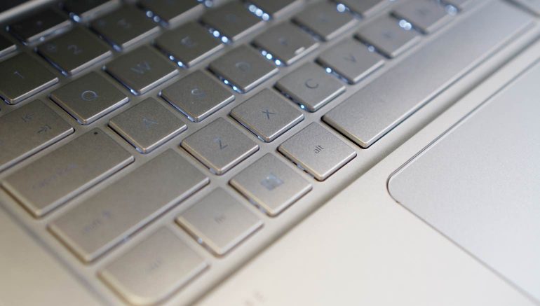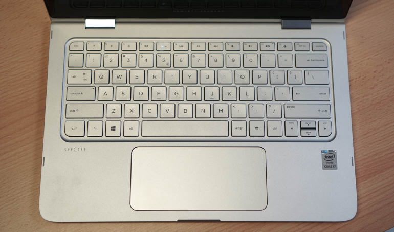 Het toetsenbord is van een volledig formaat en is voorzien van eiland-stijl toesten. Zoals je mag verwachten van een high-end computer uit deze categorie is het toetsenbord voorzien van achtergrondverlichting. De HP Spectre 13 x360 heeft verder een opvallend groot (breed) muisvlak, dit trackpad is één van de beste die we ooit op een Windows-machine hebben mogen gebruiken. Natuurlijk is er ondersteuning voor de verschillende Windows gerelateerde swipes en bewegingen maar is het vooral de goede responsiveness tijdens het scrollen dat voor een fijne gebruikerservaring zorgt.