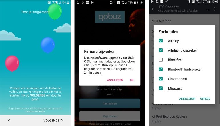 De U11 heeft een usb c-aansluiting met ondersteuning voor Quick Charge 3.0. Er is geen hoofdtelefoonaansluiting, net zoals bij de iPhone. Wel vind je in de doos een adapter om alsnog je eigen headset aan te sluiten. Het is een actieve adapter met ingebouwde elektronica. Toen we de kabel de eerste keer instaken, moesten we zelfs de firmware van de adapter updaten. Een klusje dat in een minuut of twee voorbij was, dat wel. Maar het kwam wel gek over. Er is natuurlijk veel discussie rond het afschaffen van de hoofdtelefoonuitgang. Maar hier zien we toch een voordeel, want via de usb-adapter beschik je over heel wat meer vermogen dan doorgaans het geval is bij een smartphone. Bij wijze van experiment sloten we een veeleisende hoofdtelefoon aan (een Sennheiser HD 650 met 150 ohm impedantie), en de U11 stuurde het probleemloos aan. Dat kun je maar van weinig smartphones verwachten.