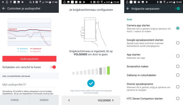 Dan komen we aan hét uithangbord van de HTC U11, Edge Sense. We hebben deze nieuwe functie bewust tot het laatste gehouden, terwijl alle marketingmateriaal er wel als eerste mee uitpakt. HTC noemt het ook een revolutionaire feature, een totaal nieuwe manier om met je smartphone te interageren. Dat klopt wel, want op de U11 kun je door te knijpen dingen doen. De camera activeren bijvoorbeeld of een app. Er is een geavanceerde modus die je kunt inschakelen, waarna je met kort en lang knijpen andere zaken kunt activeren. En op korte termijn komt er een app zodat je aan de Edge Sense-knijpfunctie app-specifieke zaken ga kunnen koppelen. Zo zal knijpen in Whatsapp bijvoorbeeld, iets anders doen dan als je knijpt in Facebook.