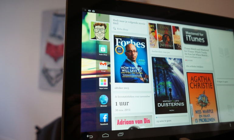 Toch ziet het er allemaal wat anders uit dan je van zo’n moderne tablet verwacht, Kobo maakt namelijk gebruik van een vrij zware skin die over Android heen ligt. Het mag geen verassing zijn dat de skin vooral ingericht is op het aanbieden van nieuwe en bestaande content in de vorm van boeken en magazines. Kobo is een merk voor lezers en dus vind je op je homescreen een grote visuele representatie van je laatste boeken, magazines en artikelen die je in Pocket hebt opgeslagen. Ook nieuwe content wordt op deze plek aangeraden, natuurlijk om de verkopen uit de Kobo Store te voeden (ze linken zover ik zie niet naar Google Play Books).