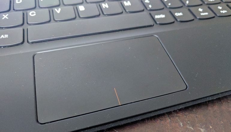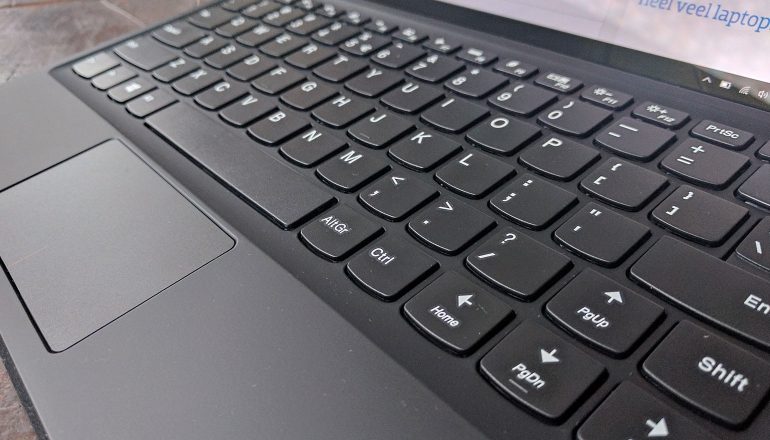 Het toetsenbord is even breed als het scherm en biedt gebruikers een complete ervaring aan. Typen op schoot met de leren accessoire is nog steeds niet te doen, omdat het bord dan meebeweegt en -buigt. Mocht je lage toetsen al gewend zijn, dan kun je hier, op een vlakke ondergrond, al rap heel snel op typen. Het is opvallend dat Lenovo voor grote pijltjestoetsen gekozen heeft en dat zal wellicht niet iedereen bekoren. Dit betekent namelijk ook dat de shift-toets aan de rechterkant kleiner is gemaakt — en die gebruiken wij eigenlijk het meest.