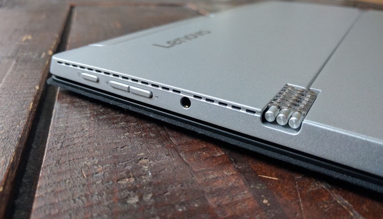 Aan de rechterkant treffen we bovenin ook nog de knoppen voor de volume en het aan- en uitzetten aan. Die zitten daar goed, hoe je het apparaat ook wil gebruiken. In laptopmodus kun je er gemakkelijk bij wanneer je erop werkt en in tabletmodus zitten ze (waarschijnlijk) net boven je vingers. Verder zit er in het midden op de achterkant nog een camera. Datzelfde geldt ook voor de voorkant, waar de camera eveneens in het midden zit. Handig voor het positioneren van jezelf en de tablet, wanneer je bijvoorbeeld een videogesprek voert.