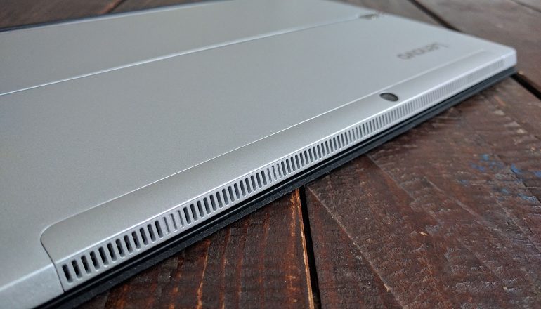 Het apparaat voelt heel stevig en fors aan dankzij zijn behuizing. Daardoor is het wellicht iets zwaarder dan concurrerende modellen, maar dat is helemaal niet erg. Het feit dat de behuizing de tablet forser en zwaarder maakt, geeft direct het idee dat de interne hardware goed beschermd wordt tegen vallen en stoten. Aan de bovenkant van de Miix 510 zit een breed raster voor de ventilatie, waar je geregeld geluid uit hoort. Dat kan even wennen zijn, omdat het geluid van die ventilatoren nogal irritant kunnen zijn tijdens het werken of kijken.
