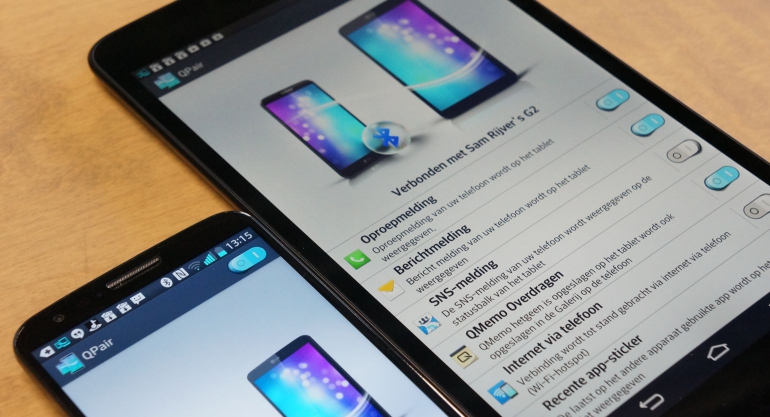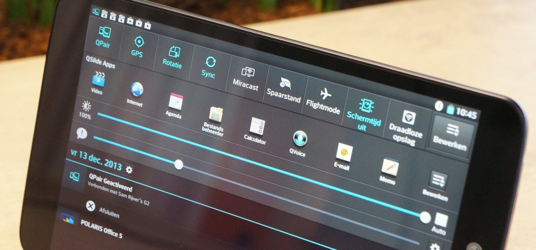 LG heeft ook verschillende apps toegevoegd aan Android en om de vergelijking met de Samsung skin weer aan te halen zijn de S-apps van Samsung vergelijkbaar met de Q-apps van LG. LG heeft QRemote, QTranslator, QVoice en QPair. De laatste is wat mij betreft verreweg de interessantste want geeft je de mogelijkheid de LG G Pad 8.3 te koppelen met een Android smartphone. Na koppeling kan je zaken als oproepen en sms berichten ontvangen en beantwoorden via de tablet, maar kan bijvoorbeeld ook de internetverbinding met je smartphone delen en memo’s synchroon houden tussen de twee apparaten. Het tofste is misschien nog wel dat je niet per se een LG smartphone hiervoor hoeft te hebben. Naast de Q-apps zijn er ook andere LG apps te vinden op de tablet zoals Notebook, Life Square en LG backup. Ook levert LG een bestandsverkenner en een Office app (Polaris 5) mee met de G Pad 8.3.