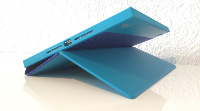 De case komt weer met hetzelfde vierkante design als de andere twee cases, met de verschillende uitsneden en plekken voor de knoppen van de iPad. De basis is hetzelfde; hetzelfde zachte materiaal waarmee de bescherming gegarandeerd wordt. Maar, aan de achterzijde van deze case is weer een ietwat andere stoffen afwerking te vinden die een premium gevoel meegeeft en waarmee ook de standaard is uitgerust. Deze standaard, de any-angle-houder, kan vanuit de achterzijde uitgeklapt worden en biedt flexibele posities voor je iPad, tot een hoek van 70 graden. Hierdoor is tikken op het toetsenbord of een filmpje kijken comfortabel.
