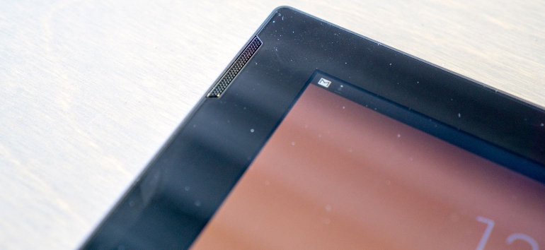 De speakers van deze tablet zitten aan de voorzijde, een keuze die we altijd wel weten te waarderen omdat dit het geluid richting de gebruiker stuurt. De relatief brede randen (bezels) rondom het scherm hebben hierdoor in ieder geval nog een extra functie gekregen. Doordat het geluid direct richting de eindgebruiker klinkt het direct een stuk beter, en hoeft het volume niet per se op volle kracht om iets te horen. Zelfs als je het volume wel op maximaal zet dan heeft men de vervorming van het geluid opvallend binnen de perken weten te houden. Natuurlijk missen ook deze kleine tablet-speakers wat in de lage tonen en detail in de hogere tonen, maar in vergelijking met andere tablets (ook duurdere tablets) zijn de speakers op deze Medion Lifetab S10333 heel aardig!