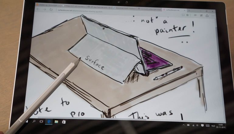In het display is natuurlijk ook nu weer een digitizer verwerkt, die in combinatie met de Microsoft Surface Stylus (nee, pen) voor prima mogelijkheden voor de artiesten en ‘schrijvers’ onder ons zorgt. Microsoft heeft het voor elkaar gekregen om de ruimte tussen het glas en het paneel extreem klein te houden zodat het schrijven op het scherm heel direct aanvoelt, alsof je daadwerkelijk op papier schrijft. Met andere woorden: als je het pennetje op het scherm zet verschijnen de ‘inkt’ pixels ook echt op die plek, en niet op een paar millimeter van de penpunt.