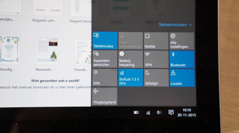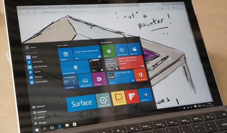 De Microsoft Surface Pro 4 komt met een Windows 10-installatie, het is fijn dat je dus niet meer hoeft te gaan updaten vanaf Windows 8.1. Deze update is dan wel gratis maar het is toch een gedoe om een Windows apparaat van een nieuw OS te voorzien. Windows 10 is waarschijnlijk bij de meeste van jullie wel bekend en in vergelijking met Windows 8.1 zijn er een paar dingen nieuw; dingen die vooral handig zijn als we kijken naar hybride apparaten zoals deze Microsoft Surface Pro 4. Je kunt Windows namelijk instellen in desktopmodus of tabletmodus, en relatief makkelijk switchen tussen die twee. Dat maakt het natuurlijk erg handig om de ‘beperkte’ tabletmodus alleen te gebruiken als je het systeem zonder keyboard gebruikt of bij je draagt. Als je de Microsoft Surface Pro 4 wat meer als laptop gebruikt is het gewoon handiger om het traditionelere desktopsysteem te gebruiken waar programma’s in een venster draaien, en het startmenu niet per se je hele scherm overneemt. Een andere gave nieuwe toevoeging van Windows 10 is Cortana, een digitale assistent (bijna kruising tussen Siri en Google Now) die je kan helpen bij zoekopdrachten, maken van afspraken en veel meer.