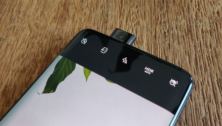 Er zijn verder andere dingen veranderd. Zo zit onderop nu de lade voor de simkaart. Daarnaast zit een usb-c-poort, vergezeld door een enkele speaker. Bovenaan het toestel treffen we een tweede speaker aan (voor stereoweergave) en geen notch. De frontcamera zit ook niet in het scherm verwerkt, zoals dat wel het geval is bij de Samsung Galaxy S10+, bijvoorbeeld. Nee, in plaats daarvan krijg je te maken met een uitschuifbare camera. Aan de achterkant treffen we overigens dit keer niet twee, maar drie camera’s aan.