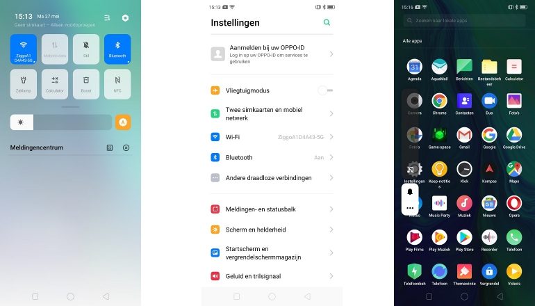 De Oppo Reno draait op Android 9.0 Pie met daaroverheen ColorOS 6. De vorige versies van ColorOS lieten te wensen over, maar ColorOS 6 is zeker een stap voorwaarts. Het is wel een vrij agressieve softwareschil, waarbij Oppo duidelijk naar iOS heeft gekeken. Dit zien we terug in grote icoontjes als je van boven naar beneden swiped voor het aanpassen van de snelle instellingen. Gelukkig kun je behoorlijk wat instellingen zelf aanpassen en is er ook een app-lade aanwezig. Swipe je vanaf het beginscherm naar het linkerscherm, dan vind je daar de slimme assistent van Oppo. Alhoewel deze behoorlijk wat informatie toont en niet zo storend is als Bixby bij toestellen van Samsung, mis ik hier toch de Google Feed.