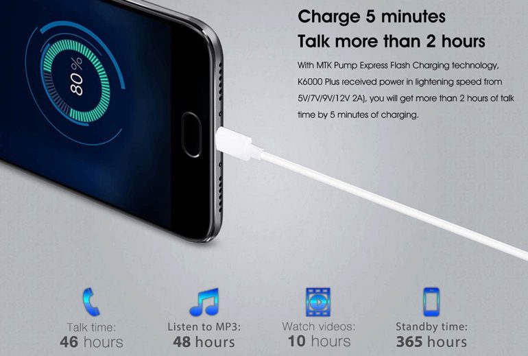 De phablet wordt geleverd met een snellader. Die biedt een weerstand van 2 ampere, wat weinig andere laadkabels aankunnen. Met de meegeleverde snellader is het toestel binnen ongeveer zeven kwartier (honderd minuten) van nul tot honderd procent op te laden. Omdat het een snellader is, kun je na vijf minuten laadtijd alweer twee uur telefoneren, beweert Oukitel. Dit hebben we niet geprobeerd, maar de claim komt ons niet onwaarschijnlijk voor.