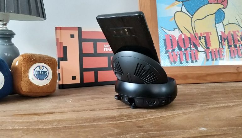 De Samsung DeX is een compacte accessoire die ongeveer honderd euro kost. Op het ronde apparaat treffen we op de achterkant twee usb-poorten aan, maar ook een hmdi-poort, een ethernetaansluiting en een usb-c-poort. Aan de bovenkant zit een schuifpaneel dat je naar achteren kunt schuiven. Wanneer je dat doet, dan tref je aan de binnenkant een usb-c-aansluiting aan en een opening waar je precies een Galaxy-smartphone in kunt plaatsen. De basis kan de gekoppelde Galaxy-smartphone schuin neerzetten en dat ziet er best tof uit.