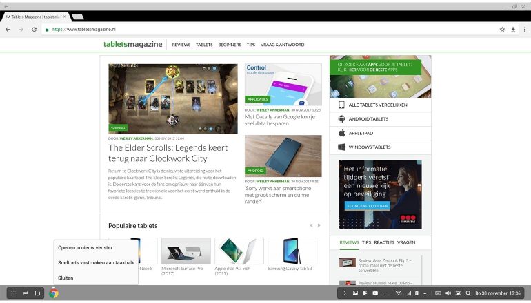 Wanneer je een app opent, dan verschijnt die meteen op de startbalk. Een tweede app natuurlijk ook en door op de iconen te drukken open je dat scherm. Wanneer je met je rechtermuisknop op dat icoontje klikt, dan zul je een klein menu openen, waarmee je bijvoorbeeld het scherm kunt sluiten. Als je een browser opent, houd er dan wel rekening mee dat je veel schermruimte kwijt bent aan balken. Je ziet namelijk de balk van de app, de balk van de tabbladen (die op Windows in de app-balk zitten) en natuurlijk zie je onderaan de startbalk staan.
