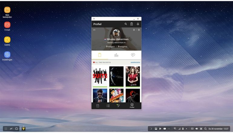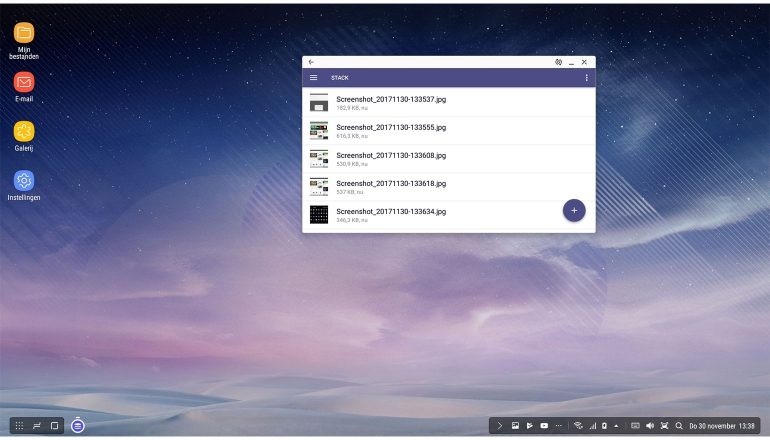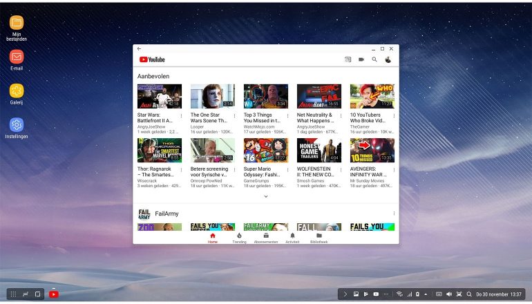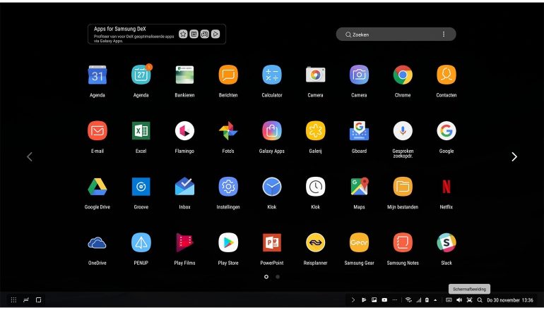 Onderaan het scherm vind je de startbalk. Daar kun je qua design weinig andere dingen mee doen. Mocht je bijvoorbeeld bekend zijn met Windows of, nog beter, Chrome OS, dan kun je hier direct mee uit de voeten. Links tref je de menuopties aan (zoals je die in het midden onderaan op een Galaxy-smartphone aantreft) en rechts staan de overige opties (die je normaal in het midden aan de bovenkant van het smartphonescherm ziet staan). Het is overzicht en netjes vormgegeven en je zult hier geen moment echt aan moeten wennen.