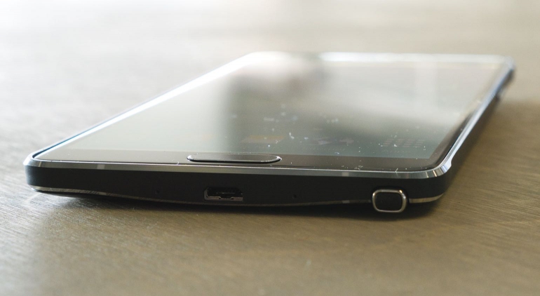 Hoewel de Samsung Galaxy Note 4 nog steeds duidelijk een Note-phablet is – er is een zekere familiegelijkenis – kun je rustig stellen dat deze nieuwste generatie wel wat verbeteringen heeft meegekregen. Op het scherm komen we natuurlijk verderop nog terug maar het design is nu alvast aan de beurt. De Samsung Galaxy Note 4 heeft namelijk nu voor het eerst een metalen behuizing, of in ieder geval metaal in de behuizing. De achterkant is nog steeds verwijderbaar en nog steeds van plastic/(nep)leer gemaakt en natuurlijk beschermt de laatste generatie Gorilla Glass de voorkant, maar wat daar tussen zit is nu van metaal. Metaal leent zich goed voor knappe bewerkingen en dus heeft deze Samsung, net als de vorige generaties iPhone, een mooie champfered edge op de plek waar glas en metaal bij elkaar samenkomen. Naast een cool en koel aanvoelende telefoon is door het metaal de phablet ook aanmerkelijk steviger voor je gevoel, en dat is natuurlijk alleen maar positief.