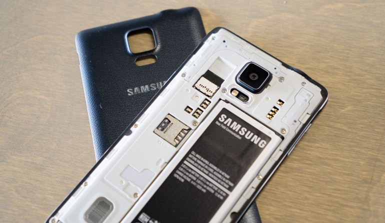 De achterkant is zoals gezegd nog steeds van een soort plastic dat op leer moet lijken. Na verschillende Samsung-producten met deze afwerking gezien te hebben moet ik toegeven er wel aan gewend te zijn geraakt, ik vind het zelfs wel ‘wat hebben’. De achterkant kan losgetrokken worden zodat de simkaart en de microSD-poort bereikbaar worden, net als de verwisselbare accu. De achterkant van de Samsung Galaxy Note 4 biedt niet alleen ruimte aan de camera maar heeft daarom nu ook een extra sensor (naast de flitser) zitten, een sensor die onder andere je hartslag kan meten.