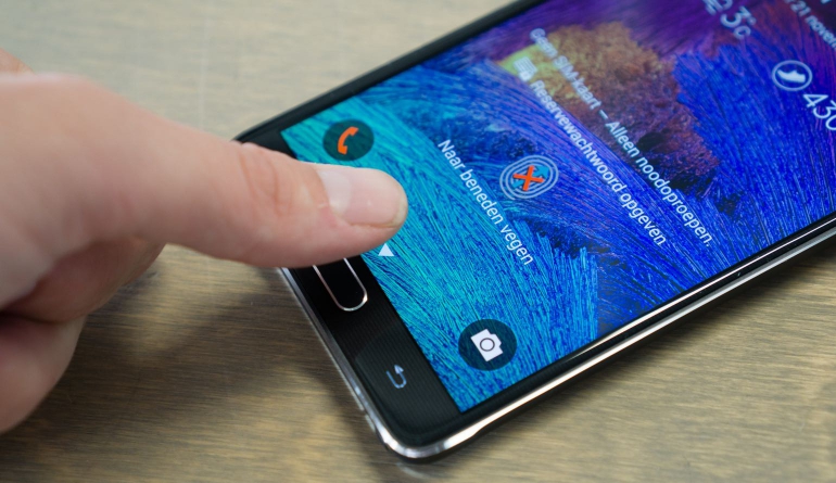 De Samsung Galaxy Note 4 voorzien van een vingerafdrukscanner. Deze optie zit – net als bij de Galaxy Tab S en andere Samsung producten – verwerkt in de homeknop en is te gebruiken om het apparaat te ontsluiten en in te loggen bij onder andere je Samsung app-account. Via een SDK kunnen ontwikkelaars er overigens ook gebruik van maken, de PayPal app heeft hier bijvoorbeeld al ondersteuning voor. Het opzetten van je vingerafdruk is lekker makkelijk; je gaat een keer of acht met je vinger over de knop als de software je daarvoor opdracht geeft en je vingerafdruk wordt in z’n verschillende kleine varianten opgeslagen. Het ontsluiten van je scherm gaat vervolgens met een (hopelijk) enkele swipe-beweging. In mijn ervaring is het systeem redelijk betrouwbaar, maar niet op hetzelfde niveau als de scanner die we op dit moment kennen van Apple in de iPhones en iPads met deze ondersteuning. Maar de scanner in de Samsung Galaxy Note 4 is zonder meer betrouwbaar genoeg om gebruikt te worden.