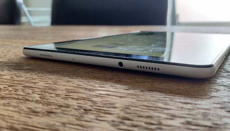 Daarnaast zijn de randen wat dikker in vergelijking met het duurdere model. Als we kijken naar eerdere Galaxy Tab A-modellen, dan zijn ze ietwat dunner gemaakt, maar ze zijn gelukkig nog steeds breed genoeg om de tablet comfortabel te kunnen vasthouden. Echter, ook hier is het zo, net als op het duurdere model, dat de vingerafdrukscanner is verdwenen. In plaats daarvan moet je het doen met de gezichtsherkenning of de traditionele methode zoals de pincode of het patroon als het om het beveiligen van je tablet gaat.