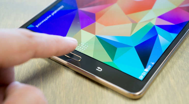 De Galaxy Tab S 8.4 en 10.5 zijn voorzien van een vingerafdrukscanner. Deze optie zit – net als bij de Galaxy S5 smartphone – verwerkt in de homeknop en is te gebruiken om het apparaat te ontsluiten en in te loggen bij onder andere je Samsung app-account. Via een SDK kunnen ontwikkelaars er overigens ook gebruik van maken, de PayPal app heeft hier bijvoorbeeld al ondersteuning voor. Het opzetten van je vingerafdruk is lekker makkelijk; je gaat een keer of 8 met je vinger over de knop als de software je daarvoor opdracht geeft en je vingerafdruk wordt in z’n verschillende kleine varianten opgeslagen. Het unlocken van je scherm gaat vervolgens met een (hopelijk) enkele swipe-beweging. In mijn ervaring is het systeem redelijk betrouwbaar, maar niet op hetzelfde niveau als de scanner die we op dit moment kennen van Apple in de iPhone 5s. Maar de scanner in de Samsung Galaxy Tab S is zonder meer betrouwbaar genoeg om gebruikt te worden.