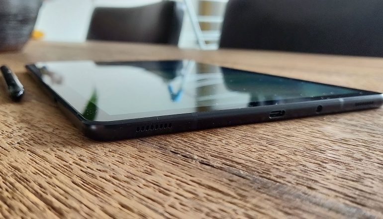De knoppen voor het volume en het in- en uitschakelen zitten op dezelfde plek als op de Galaxy Tab S3; datzelfde geldt voor de sleuf voor de sim- en micro-sd-kaart. Onderaan treffen we de usb-c- en koptelefoonaansluiting aan. Verder heeft Samsung weinig designveranderingen doorgevoerd. Opvallend zijn verder nog wel de vier speakers op het toestel. Wanneer je de tablet in horizontale stand vasthoudt, dan zitten die speakers aan de zijkant. Dat was ook al op de Tab S3 het geval, dus heel veel is er eigenlijk niet veranderd.