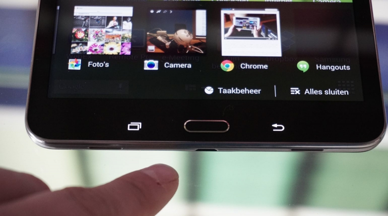 Naast de keuze voor materialen is de plaatsing van de de ‘knoppen’ op Samsung producten ook een van de zaken die standaard op dezelfde plek terechtkomen. Dit betekent dat je dus ook op de Samsung Galaxy TabPRO 8.4 een aanrakingsgevoelige multitask en terug-knop vindt, met in het midden de fysieke (eentje die dus echt klikt!) homeknop. De aanrakingsgevoelige knoppen lichten, net zoals altijd, op bij aanraking.