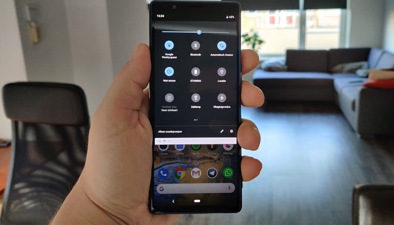 Daarnaast missen we een fatsoenlijke donkere modus voor het systeem. De Sony Xperia 5 biedt de optie wel aan binnen de instellingen van Android, maar dit geldt helaas niet voor heel het systeem. Wanneer je de dark mode activeert, dan is alleen het snelle menu in donkere kleuren beschikbaar (het menu aan de bovenkant, dat je naar beneden trekt). De rest van het systeem heeft nog steeds witte en lichte kleuren. Dat vreet meer energie dan donkere kleuren en kan ook nog eens vervelend ogen in het donker.