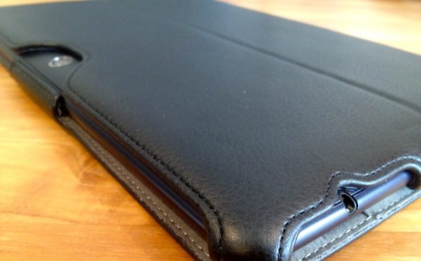 Deze Tabcover is gemaakt van een synthetisch leer. Doordat er vrij veel padding is in de hoes voelt het wel erg lekker aan en is het een van de betere imitatie leren die ik op een hoes gezien heb. Door de padding is de hoes natuurlijk wel een stuk dikker geworden.