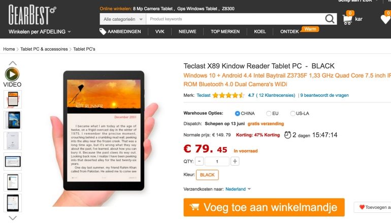 Voor lezers van Tabletsmagazine hebben we een tip. Gearbest, de Chinese webwinkel waar wij deze tablet vandaan hebben voor deze review, heeft met ingang van vandaag een tijdelijke aanbieding waardoor veel producten inclusief deze Teclast-tablet twee tot drie tientjes goedkoper zijn te krijgen. Als je de links naar Gearbest onder de foto hieronder deze website volgt, zorgt deze webwinkel er bovendien voor dat de producten via het Europese magazijn worden verstuurd, zo is ons beloofd. Dat scheelt importheffingen en garandeert een veel snellere levering. Extra tip: controleer dit nog maar even goed bij de bestelling.