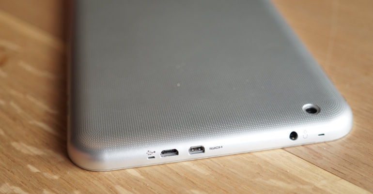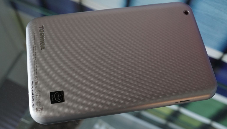De achterkant van de Toshiba Encore is van een zilverkleurig plastic en heeft een bultjes-structuur meegekregen, ongetwijfeld bedoeld om wat extra grip te bieden. De achterkant biedt verder ook de ruimte aan de camera. De achterkant van de behuizing bolt zachtjes richting de voorkant en omrandt de volledige voorkant, het glas ligt dus ‘in’ de achterkant. In de randen zijn natuurlijk de verschillende knoppen en uitsparingen verwerkt voor zaken als het microSD-slot en de speakers.