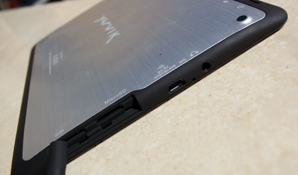Ook is de tablet voorzien van diverse aansluitingen, waaronder aan de zijde een micro usb-poort met zowel host- als slave-functie, een SIMkaart-gleuf voor mobiel internet en telefoongesprekken, en een microSD-kaartlezer waarmee het geheugen uitgebreid kan worden. De laatste twee gleuven zitten verstopt achter een klepje dan eenvoudig te openen en te sluiten is.