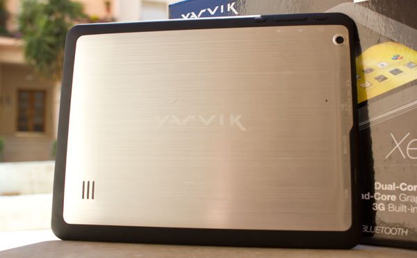 Waar budgettablets vorig jaar qua design nog weinig interessants boden weten fabrikanten als Yarvik dit jaar een stuk betere indruk te maken. De TAB08-201 Xenta 8c is een qua uiterlijk in ieder geval aantrekkelijke tablet met een nagenoeg compleet zwarte voorzijde waarvan de bezels aan de ietwat dikke kant zijn. De achterzijde heeft en grijs/zwarte afwerking maar in het midden is een grote aluminium/plastic inleg geplaatst waarop het logo en de beschrijvingen van de aansluitingen te vinden zijn. Hoewel het wellicht niet van de hoogste kwaliteit is geeft dit toch net dat beetje extra uitstraling aan de tablet mee. Aan de achterzijde zien we ook nog een camera terug de iets uit het design steekt, en een kleine speakergrill.