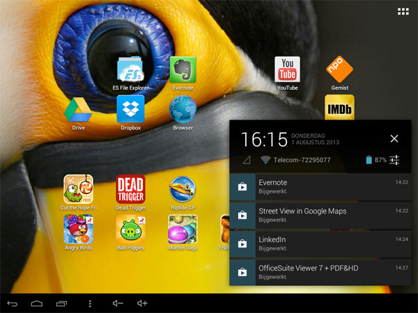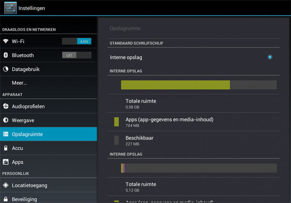 Qua software hoef je dus geen bijzonderheden te verwachten en kun je zelf aan de om de tablet in te richten. Toch is er wel een belangrijke beperking die (wederom) opgelegd wordt. Ik heb het in eerdere reviews van tablets van onder meer Yarvik en Point of View al besproken; de beperking van het opslaggeheugen voor apps. Yarvik geef je van de 8GB aan opslaggeheugen maar één GB aan ruimte voor het opslaan van apps. Daar zit je als intensieve gebruiker natuurlijk zo aan, zeker wanneer je wat spelletjes downloadt. Ik begrijp nog steeds niet waarom deze beperking wordt opgeleverd. De keuze van het indelen van het opslaggeheugen zou aan de gebruiker zelf overgelaten moeten worden.