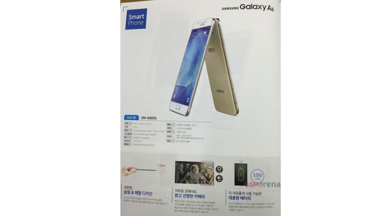Andere specificaties die zijn opgedoken in die brochure is bijvoorbeeld de zestien megapixel-camera op het apparaat. Die camera wordt voorzien van een f/1.9-opening, inclusief Real-Time HDR. De camera lijkt in wezen erg op die van de Samsung Galaxy S6-smartphone. Ook krijgt het toestel een camera van vijf megapixels aan de voorkant en wordt hij slechts 5,9 centimeter dun – daarmee is het de dunste Samsung tot op heden. De A8 wordt verder voorzien van TouchWiz, die bovenop Android 5.1.1 zal worden gelegd.