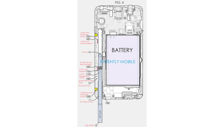 Het patent wijst op een simpel magnetisch mechanisme. In de Galaxy Note 5 en de stylus zouden magneten zitten die ervoor moeten zorgen dat beide stukken hardware aan elkaar vast blijven zitten wanneer dat nodig is. Door ervoor te zorgen dat de polarisatie van de magneten wordt omgedraaid, plopt de stylus vanzelf los en daardoor kun je hem gemakkelijker uit de phablet halen. Hoe die polarisatie wordt omgedraaid, is helaas niet bekend; gaat het via een stemcommando, een extra hardwareknop of een beweging?