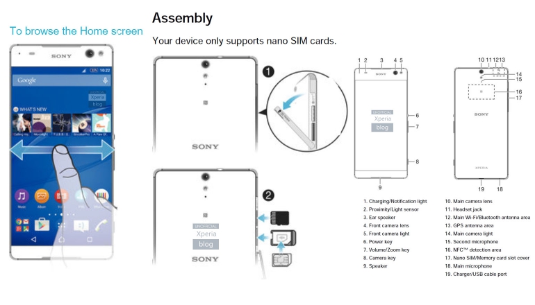 De Sony Xperia C5 Ultra moet een nieuwe toekomst voor Sony-smartphones en -phablets gaan inluiden met dit nieuwe design, aangezien er vaak kritiek op andere Sony-toestellen was door de brede randen aan de zijkanten. De C5 Ultra wordt voorzien van een camera met een flitser, een speaker aan de voorkant, een fysiek knopje voor de camera, een microSD-kaartgleuf en heeft ruimte voor een nanosim-kaart. Die twee kaartjes gaan er aan de zijkant in van het apparaat – aan de rechterkant om precies te zijn (van achteren gezien).