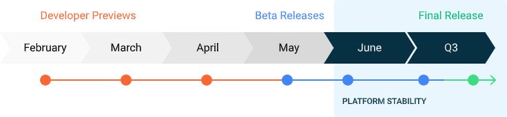Deze maand, volgende maand en de maand erna zijn de verschillende Android-versies dus echt bedoeld voor ontwikkelaars. Pas vanaf mei kunnen ook andere mensen zich aanmelden voor het uitproberen. In juni en het derde kwartaal verschijnen de laatste bèta’s; daarna mogen we de stabiele release verwachten.