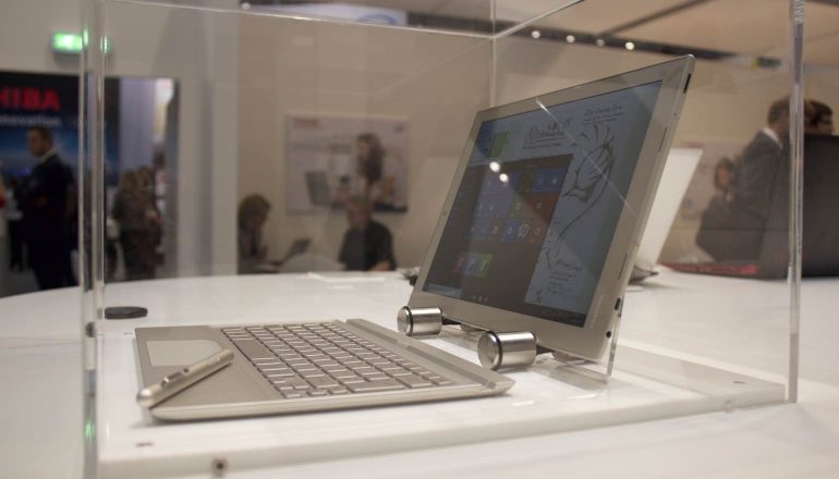 De fabrikant Toshiba heeft tijdens de IFA-beurs in Berlijn een prototype van een speciale tablet gepresenteerd, dat het bedrijf voorlopig de DynaBook noemt. De Toshiba DynaBook is een ontzettende lichte tablet. De eerst aanraking met de tablet doet denken dat je met een dummy te maken hebt (zonder batterij), terwijl het in feite een werkend model is. Dat is een mooie en opvallende presentatie, zeker voor een tablethybride die een scherm heeft van twaalf inch.