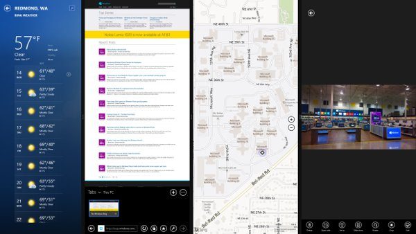 Een belangrijke verbetering zien we terug in de Snap View. Hiermee kunnen apps naast elkaar gedraaid worden, afhankelijk van de resolutie van het scherm. Binnen Windows 8.1 is het mogelijk om ook andere verdelingen dan 30/70 te gebruiken, bijvoorbeeld een 50/50 weergave. Wel moeten apps bepaalde weergaven ondersteunen om hiervoor gebruikt te worden. Wanneer je over een tablet, desktop of laptop met hoge resolutie display beschikt is het zelfs mogelijk drie of meer apps naast elkaar te draaien. Voor de laagste resolutie, 1.024 bij 768 pixels, geldt een 50/50 Snap View voor twee apps.