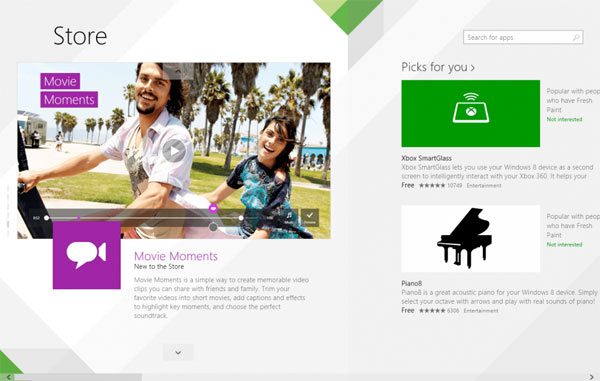 De Windows Store, de plek waar de apps gedownload kunnen worden, heeft ook een make-over gekregen waarbij de focus ligt op een duidelijkere weergave van een app, grotere afbeeldingen en meer en betere suggesties voor gerelateerde apps. Daarbij moet het eenvoudiger worden populaire applicaties te vinden door een simpele swype-beweging uit te voeren en Microsoft heeft een nieuw suggestie-algoritme ontwikkeld waarmee voor jou interessante apps getoond worden. Niet geheel onbelangrijk is dat apps in het vervolg ook in de achtergrond geüpdatet kunnen worden.