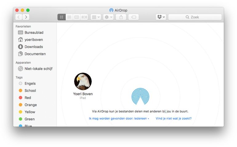 De andere manier is in de Finder. Door in de Finder de toetsen SHIFT + CMD + R in te drukken kom je op de AirDrop-pagina waar alle apparaten in je omgeving staan. Door een bestand naar één van de apparaten te slepen wordt het bestand verstuurd.