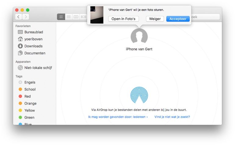 Open de AirDrop-pagina door in Finder opnieuw de toetsen SHIFT + CMD + R tegelijk in te drukken. Klik onderaan de pagina op: ‘Ik mag worden gevonden door’. Wanneer het versturende apparaat in uw contacten staat selecteert u hier ‘contacten’ en anders selecteert u ‘iedereen’.