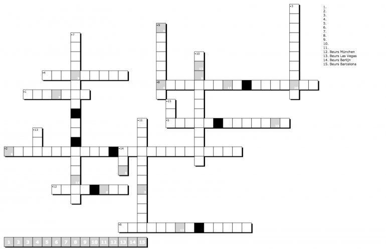- Nummer 12, 13 , 14 en 15 zijn aan de puzzel toegevoegd en zijn namen van beurzen die de redactie van FWD regelmatig bezoekt.