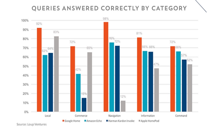 De vier stemassistenten hebben allemaal 782 vragen gekregen die ze moesten beantwoorden. Siri van Apple wist slechts 52,3 procent van die vragen goed te beantwoorden, waardoor die op de laatste plaats terechtgekomen is. Microsofts Cortana staat net boven Siri met 57 procent. Alexa scoorde een percentage van 64 procent aan goede antwoorden, terwijl Google Assistant, via Google Home, 81 procent goed beantwoorde. Dat Siri hier slecht scoort heeft te maken met de opzet van de stemassistent op de slimme speaker.