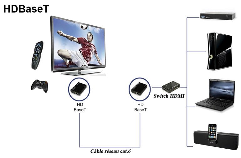 Bij HDBaseT overbrug je met een zender, een (in het apparaat ingebouwde) ontvanger en een CAT5e/6/7 netwerkkabel AV-signalen die over een afstand van gemiddeld 100 meter worden gezonden. Naast beeld en geluid transporteert dit lAN ook Ethernet, IR (Infrarood) en tot wel 100 Watt (DC) gelijkstroom door dezelfde kabel heen.