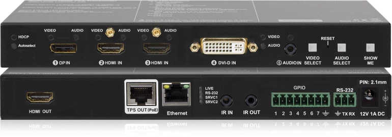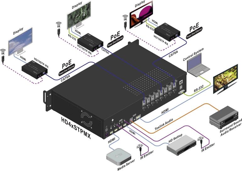 Power Over Ethernet (PoE) voorziet in de voeding tot 100 Watt bij de op HDBaseT-kabels aangesloten apparaten. Dan is er geen aparte voeding meer nodig. Power over HDBaseT volstaat. Bij de besturing op afstand variëren de mogelijkheden van het simpel aan en uit zetten en play of stop tot RS232/USB of IR-aansturing van de gangbare apparaat functies. Het aansturen van aangesloten apparaten is onder meer van belang bij evenementen. Bijvoorbeeld het aansturen van videobeamers, al of niet voorzien van een ingebouwd of opgeklikt interface voor HDBaseT. Wij noemen het schalen, zoomen, synchroniseren van meerdere projectoren voor één beeld op het scherm, en intensiteit van het licht.