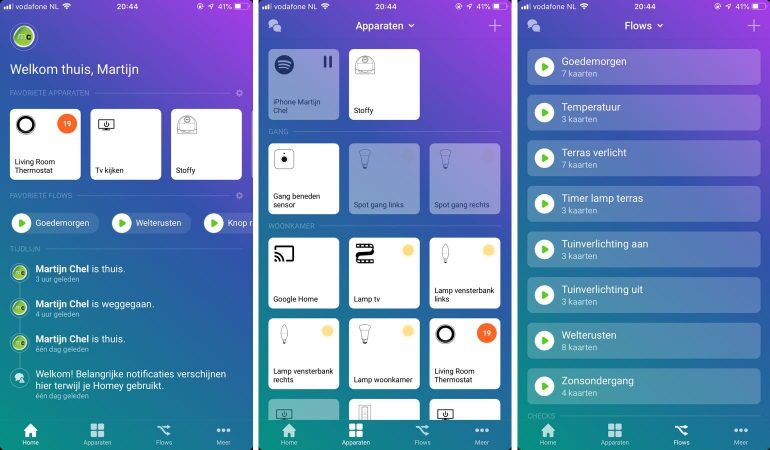 Een heel belangrijk van de laatste update is de compleet vernieuwde app. Deze Homey-app is hét middelpunt van je huis, waar je al je apparaten kunt vinden, waar je Flows kunt aanmaken en waar je instellingen kunt aanpassen. De app heeft een fris en modern uiterlijk, werkt soepel en biedt zeer uitgebreide mogelijkheden om jouw huis te automatiseren. Enig minpuntje is dat de app heel soms (vooral bij het opstarten) een paar seconden de verbinding met de hub kan verliezen.